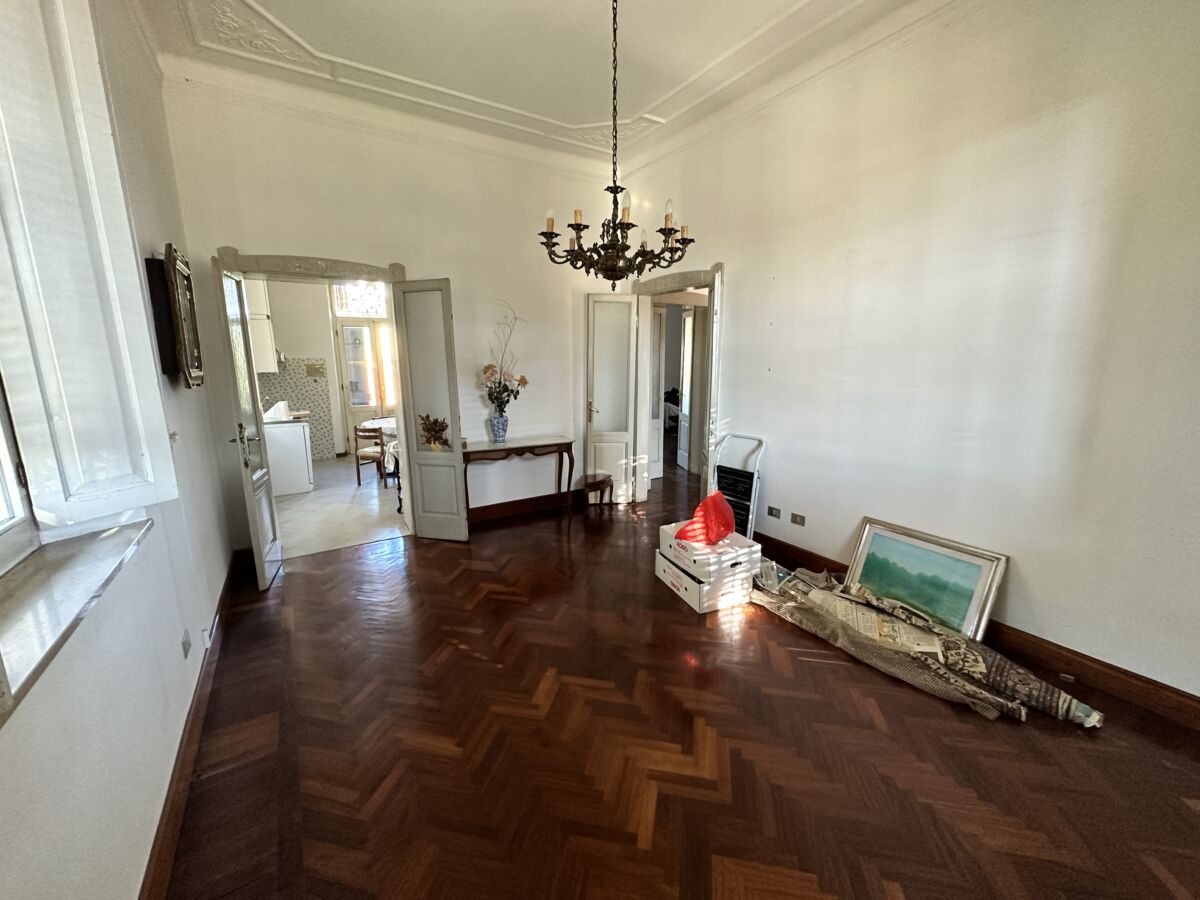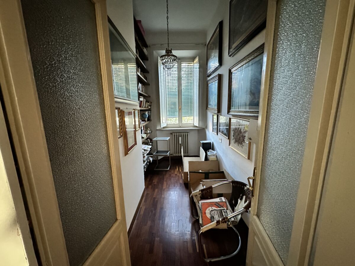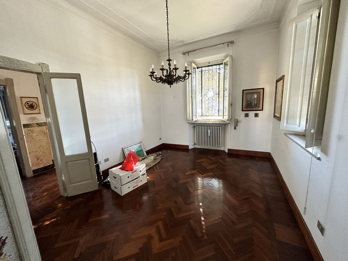 La luce esterna pervade l’immobile nella sua totalità facendone risaltare le pareti bianche ed esaltandone le pregevoli finiture, prima fra tutte la pavimentazione in parquet a spina di pesce di rovere scuro e le cornici che sottolineano le originali porte.
