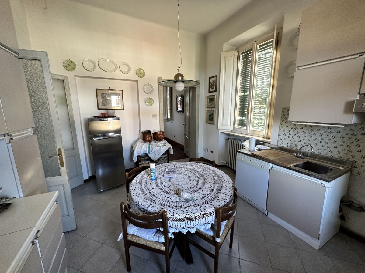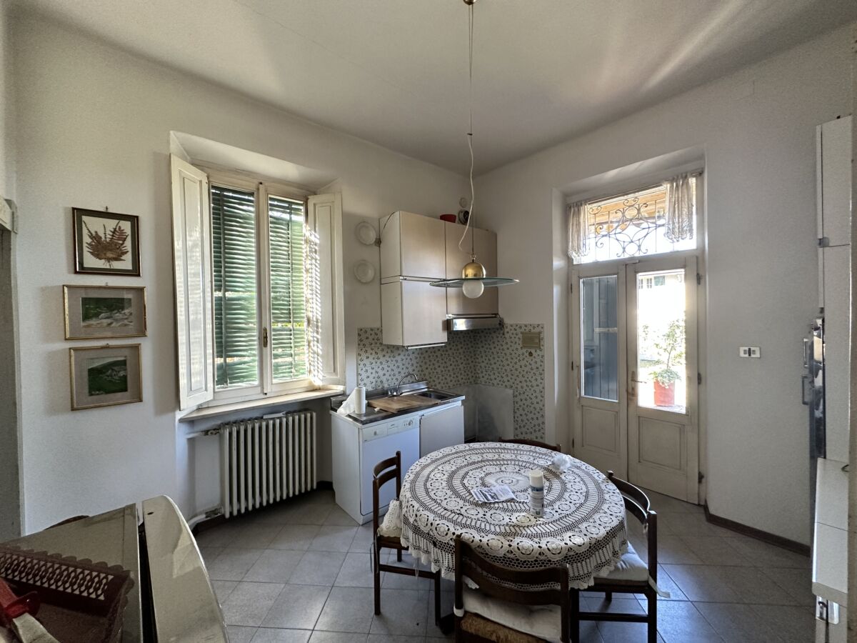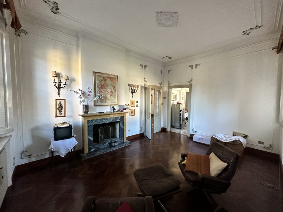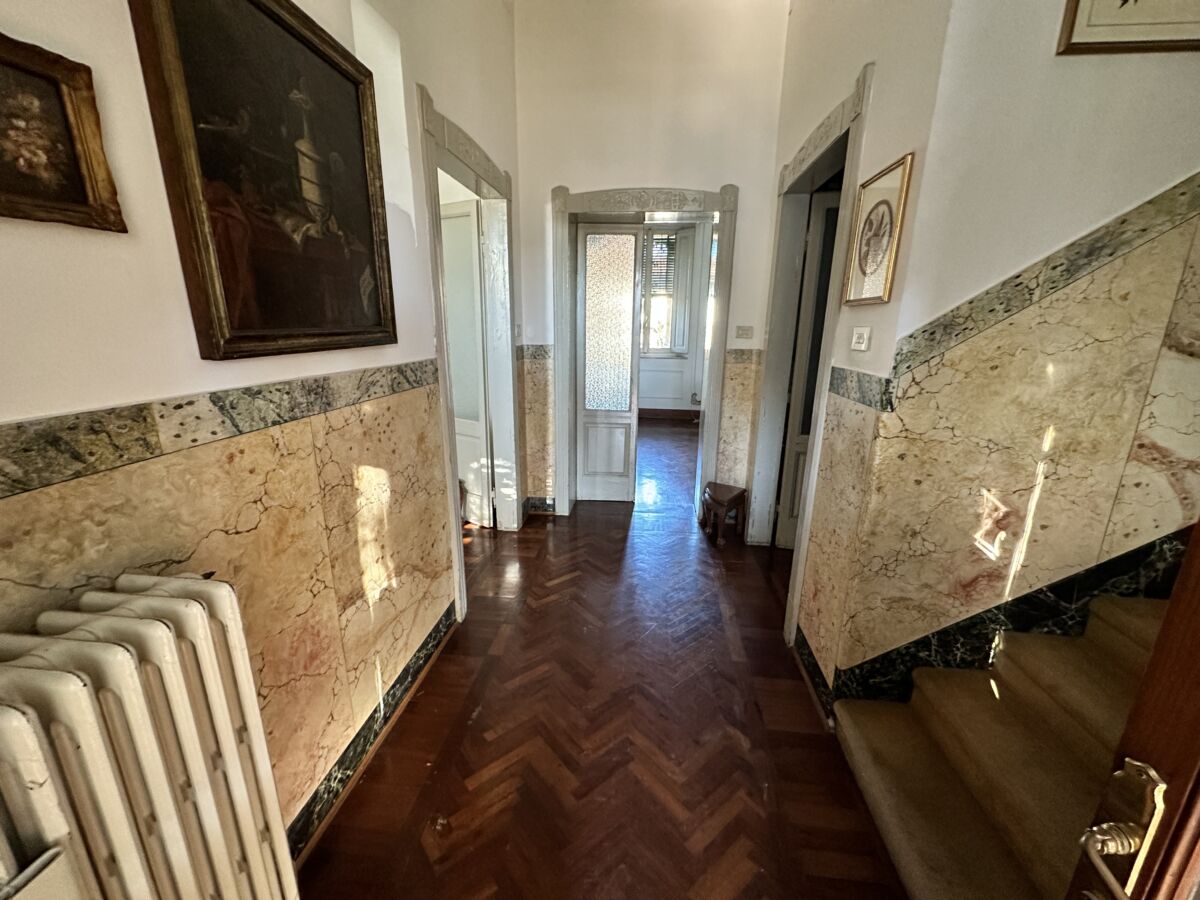 La luce esterna pervade l’immobile nella sua totalità facendone risaltare le pareti bianche ed esaltandone le pregevoli finiture, prima fra tutte la pavimentazione in parquet a spina di pesce di rovere scuro e le cornici che sottolineano le originali porte.
