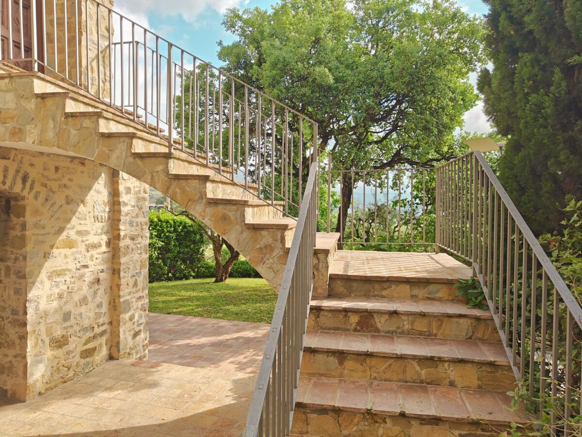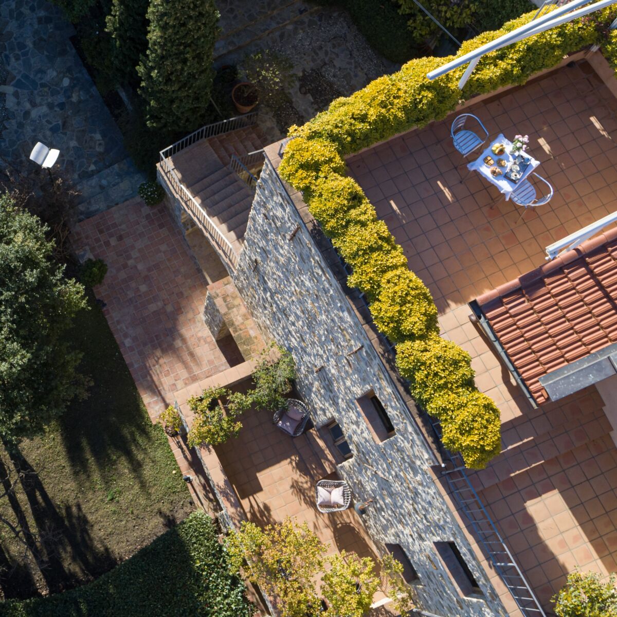 Circondata da un’ importante recinzione che garantisce riservatezza e privacy, all’esterno ci si trova immersi in un meraviglioso e curato giardino con piantumazione mediterranea e alberi adulti al alto fusto tra i quali: cipressi, ulivi, mimose, sugheri, melograni e diversi cespugli di macchia mediterranea che garantiscono la rotazione delle fioriture.